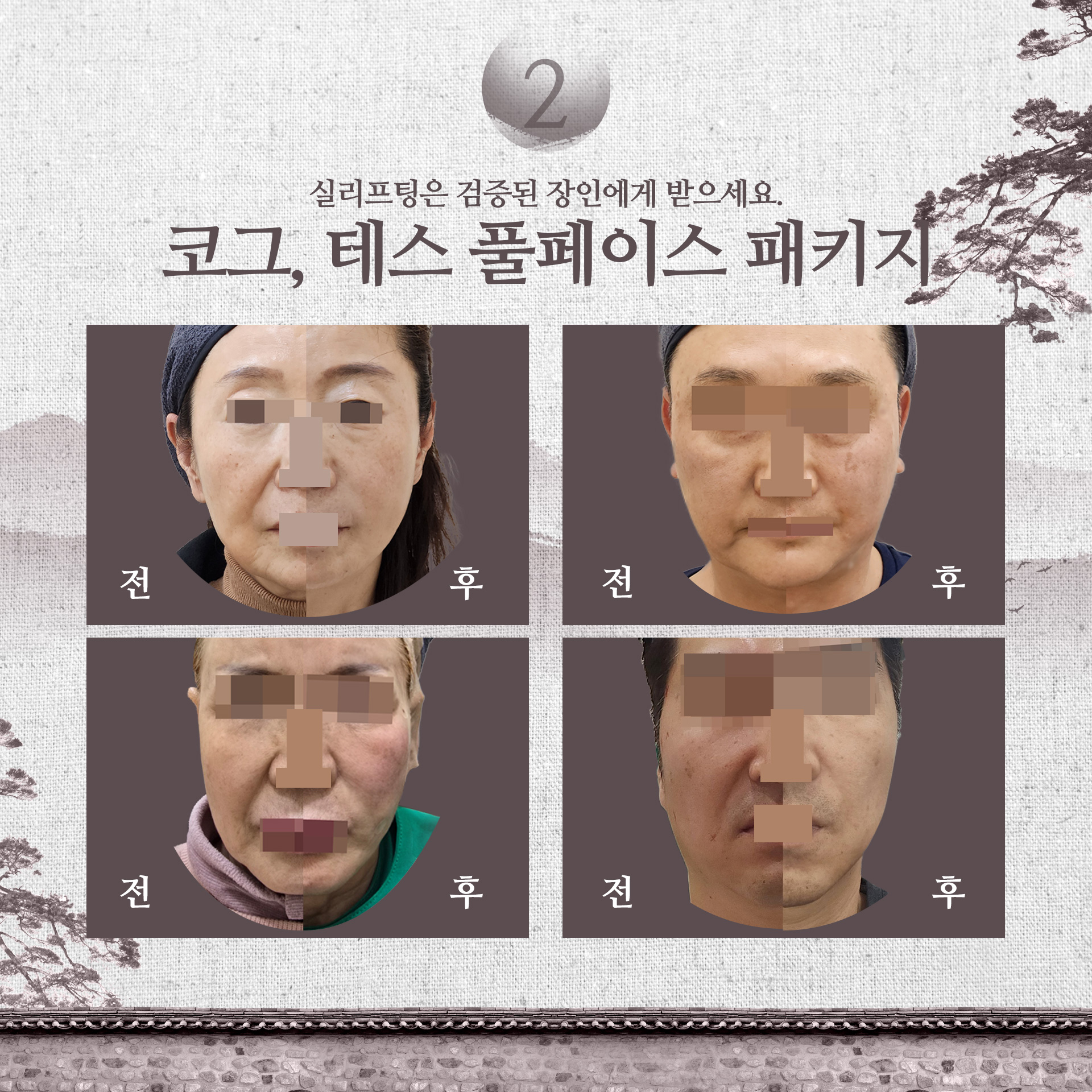 그리고 자연스러운 리프팅 보다는 완전히 쫙 당겨지는게 좋으신 분들은 코그나 테스 풀페이스 패키지도 추천드립니다. 특히 테스실리프팅은 피부조직에 단단하게 고정되어 강하게 리프팅 되는 특징이 있기 때문에 피부 두께가 비교적 두꺼운 남성분들께도 인기 있는 실입니다.